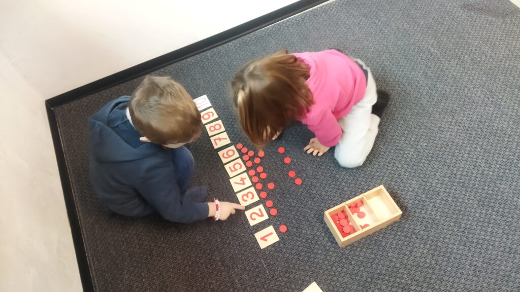 Man mano che diventano più familiari e a loro agio con i numeri da 1 a 10, viene introdotto il sistema decimale passando dalla quantità al simbolo. Fondamentalmente, stanno imparando attraverso la scoperta – non perché qualcuno glielo dice – e lentamente sviluppano un entusiasmo per il mondo dei numeri.